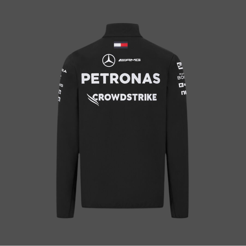 Designed for fans of speed and style, this black jacket from the official Mercedes-AMG Petronas collection merges performance and premium fashion. Printed sponsor logos on chest, sleeves and back affirm your support, 2 zipped side pockets and tricolour striped cuffs add comfort and detail. A Tommy Hilfiger logo sits proudly at the back of the collar, reflecting the collaboration’s heritage. A must-have for every F1 enthusiast seeking a casual yet bold look.