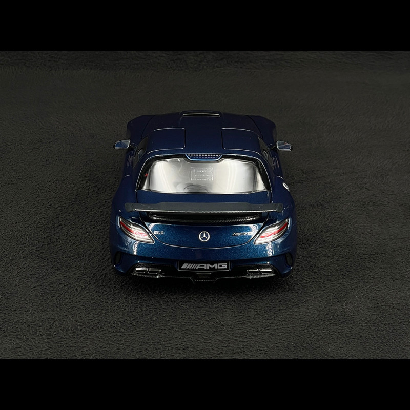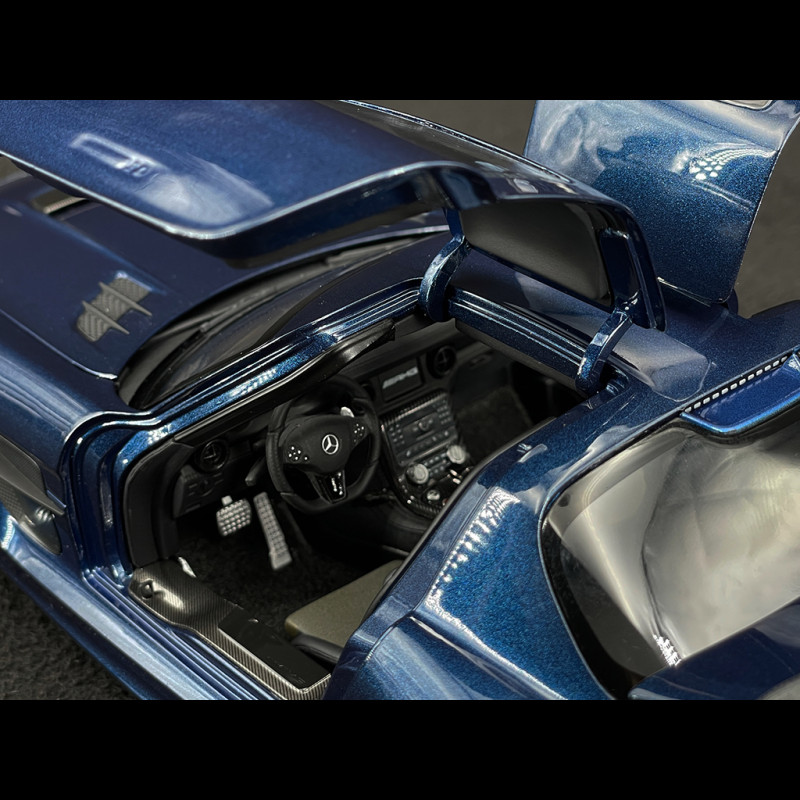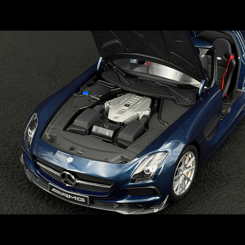The Minichamps 1/18 scale miniature reproduces this configuration in "AMG Daytona Blue," an intense metallic blue that highlights the gaping air intakes, the intricately sculpted front bumper, and the wide rear wing. Made in diecast, officially licensed by Mercedes, and announced as a limited edition, it is now sold out at most retailers and is positioned as a premium piece for a Mercedes/AMG display case, especially when displayed alongside other SLS models (standard, GT, and other Black Series colors).