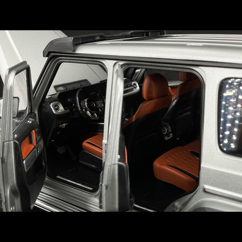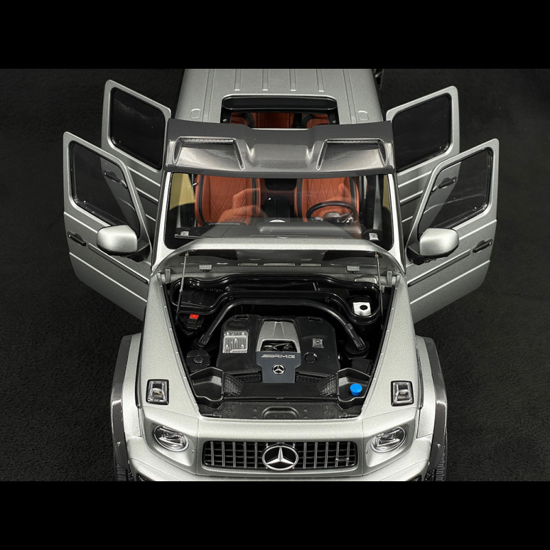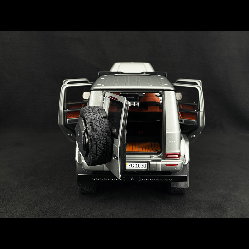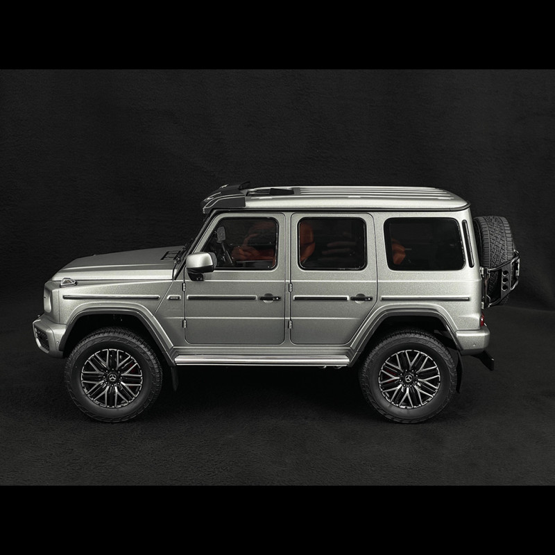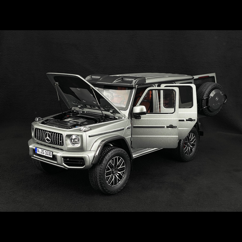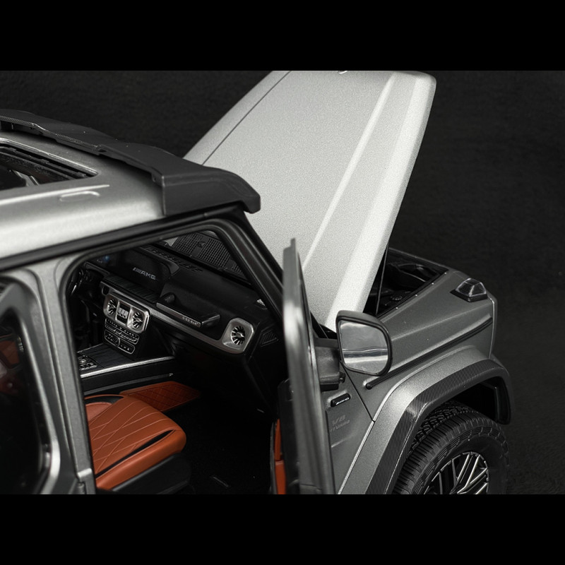 This collector's miniature faithfully replicates the 2024 Mercedes-AMG G63 4x4 in its distinctive Platinum Grey finish. It features a detailed interior, opening doors, and functional steering. The high-quality finish and precise detailing make it a must-have for enthusiasts of the three-pointed star brand.