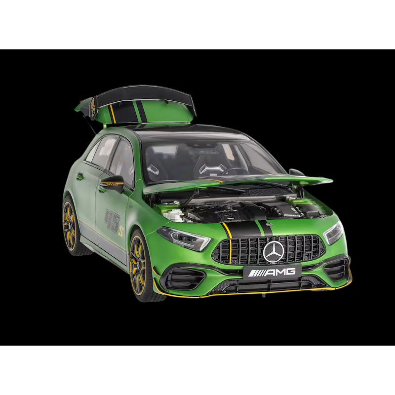 This 1:18 scale miniature of the 2024 Mercedes-AMG A45 S 4MATIC faithfully reproduces one of the most spectacular compact sports cars of the moment. Manufactured by NZG, renowned for its high-quality model cars, this collector's item stands out with its two-tone Green/Yellow livery, which immediately captures attention and gives character to this iconic compact sports car. Ready for display, it features opening parts (doors, hood, or trunk depending on the version), revealing a detailed interior, faithfully reproduced to scale. The exterior meticulously respects the lines of the original: grille, headlights, sporty wheels, and the characteristic proportions of the A45 S AMG. Made from die-cast metal with numerous precise plastic parts, this miniature combines robustness with a fine finish. It measures approximately 24 cm in length, an ideal scale for display on a shelf, in a showcase or at the center of a Mercedes-AMG collection.