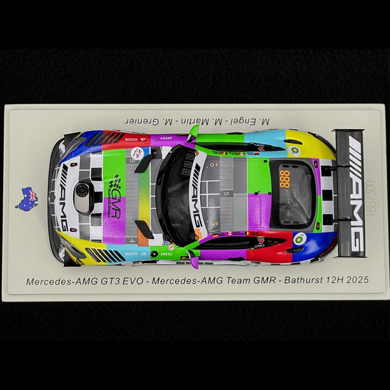 The 1:43 scale Mercedes-AMG GT3 Evo #888 – Bathurst 12 Hour 2025 model, produced by Spark Models, is a meticulous reproduction of the Mercedes-AMG Team GMR race car driven by Maro Engel, Maxime Martin, and Mikaël Grenier in the 2025 edition of this famous Australian endurance race.