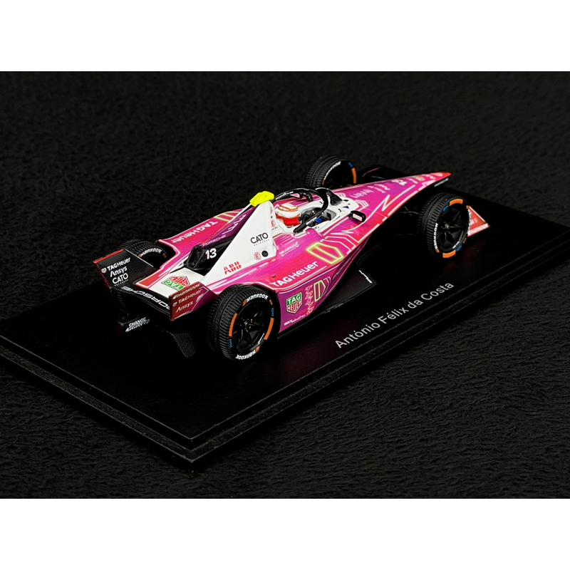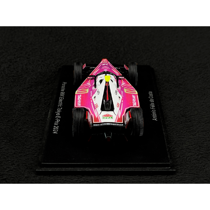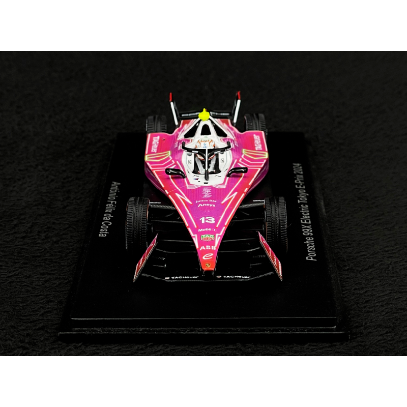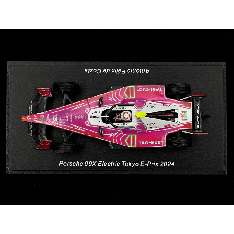 The 1/43 scale Porsche 99X Electric model #13 reproduces António Félix da Costa's 2024 Tokyo E-Prix car, featuring the angular and compact silhouette of the Gen3: short nose, vented front wings, central cockpit, and a very truncated rear. The livery incorporates the fluorescent "Tokyo" design inspired by neon lights, with clearly printed Porsche, TAG Heuer, and partner logos and motifs on the nose, sides, rear wing, and halo.