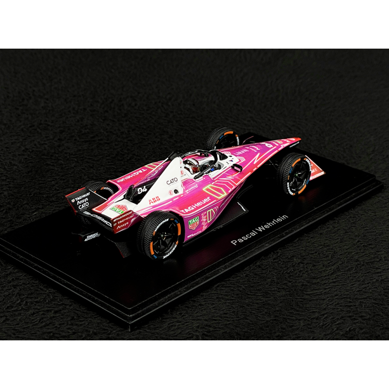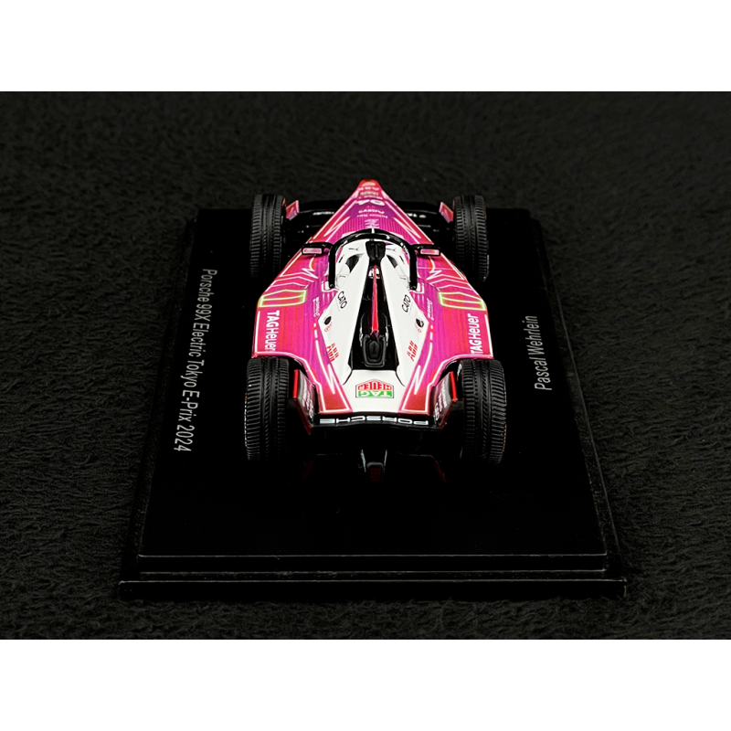 The 1/43 scale Porsche 99X Electric model #94 reproduces Pascal Wehrlein's single-seater from the 2024 Tokyo E-Prix, featuring the angular and compact bodywork typical of Gen3 Formula E cars: short nose, cut-out front wings, single-seat cockpit, and truncated rear. The model incorporates the special Tokyo fluorescent livery, directly inspired by the city's neon lights, with vibrant colors contrasting with darker areas, as well as all the official Porsche, TAG Heuer, and partner markings, precisely pad-printed.