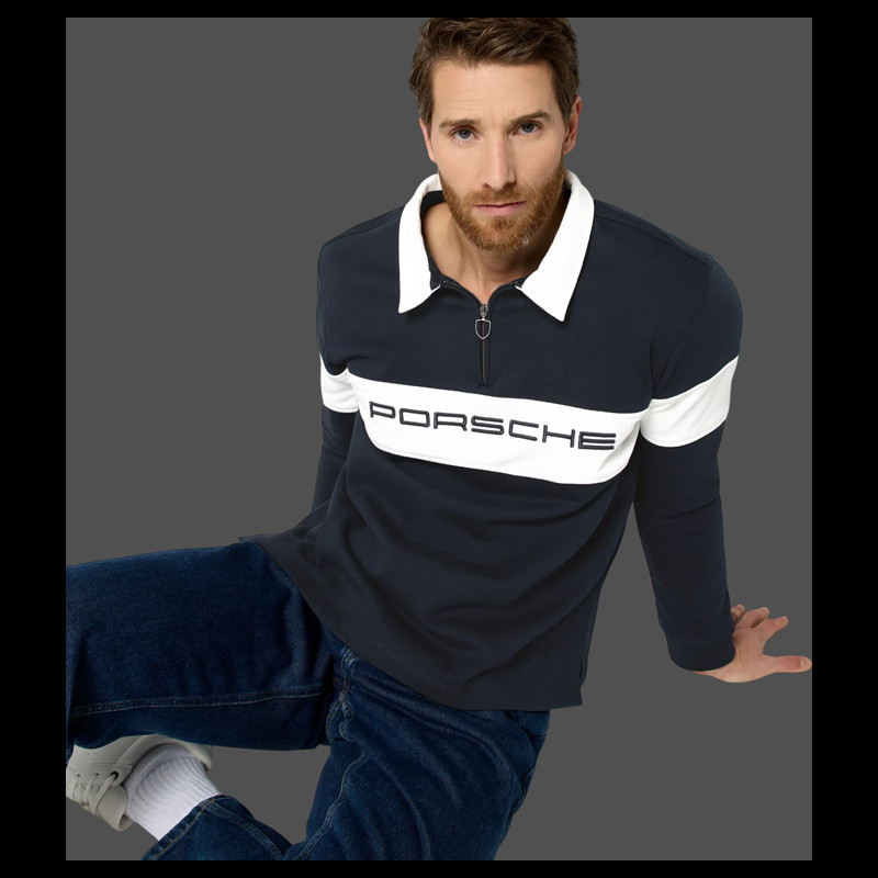 Porsche Polo Shirt long-sleeved Retro Navy Blue / White WAP813TFWR - unisex