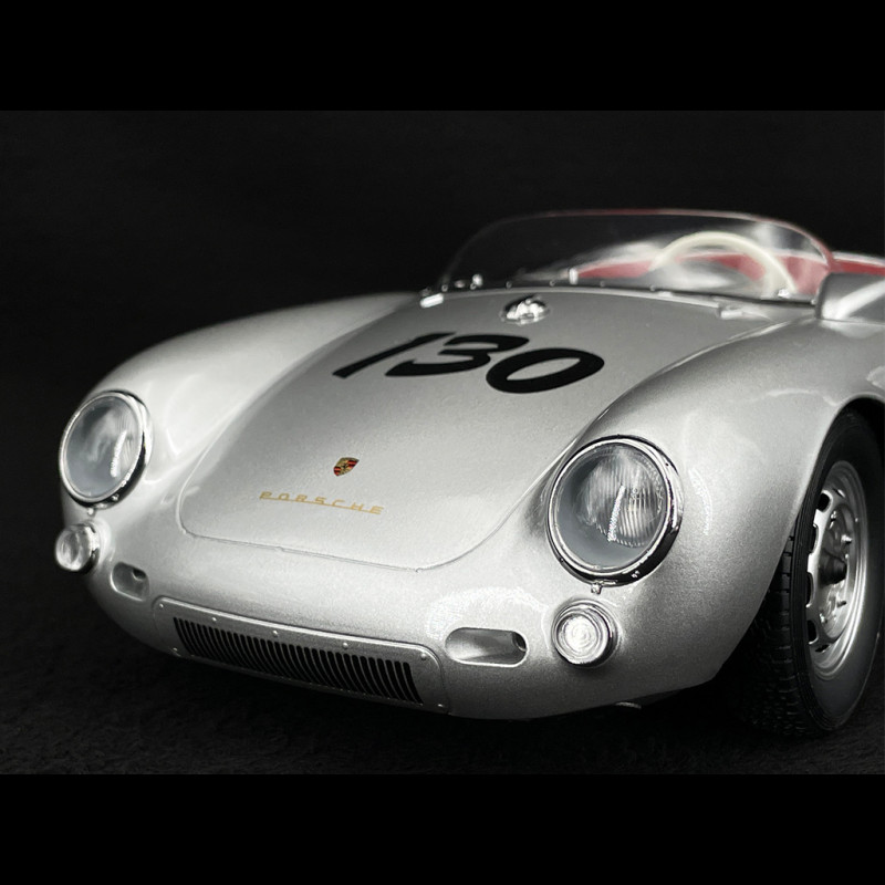 Dive into the heart of the legendary history of cinema and automobiles with this unique duo for passionate collectors. This set brings together the legendary 1956 Porsche 550 A Spyder No. 130 “Little Bastard,” in a gleaming silver finish, and a James Dean figurine, immortalized in his rebellious style, creating a vivid and evocative diorama.