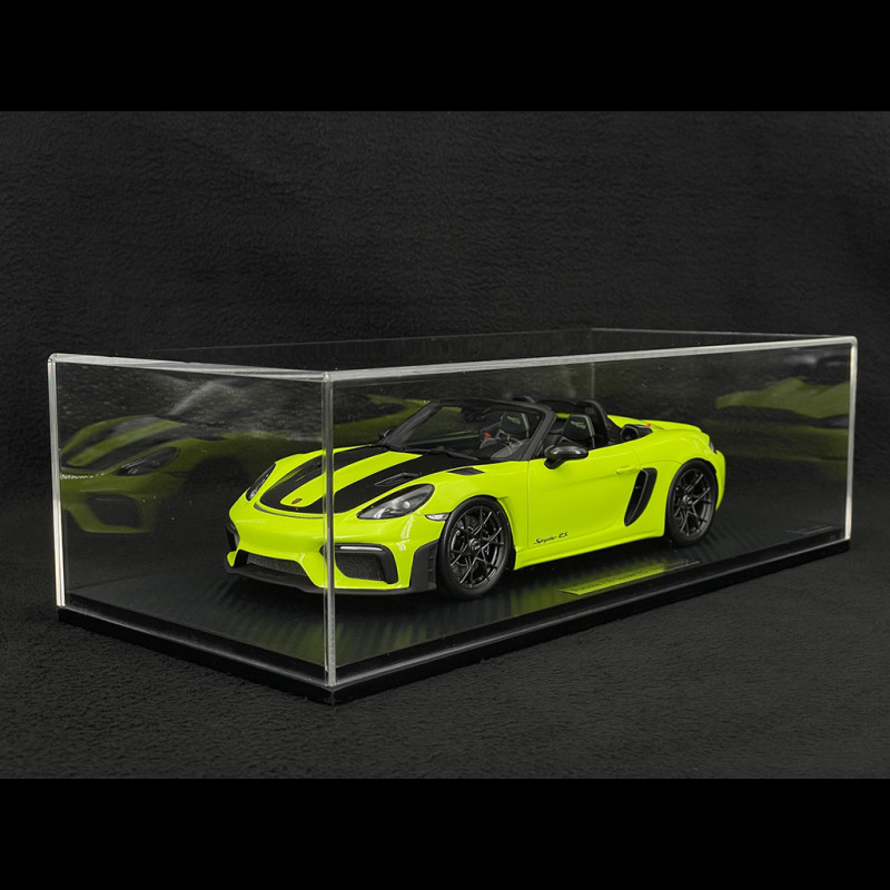 This 1:18 scale model faithfully reproduces the iconic roadster in its Acid Green livery. Every exterior and interior detail, from the wheels to the seats, is meticulously crafted, with metallic finishes and a carbon-effect base. Individually numbered (limited edition of 150 pieces), it is presented in a collector's display case, making this a rare and prestigious collector's item for Porsche enthusiasts.