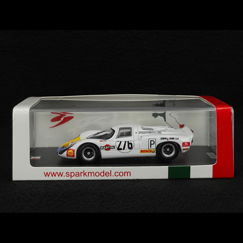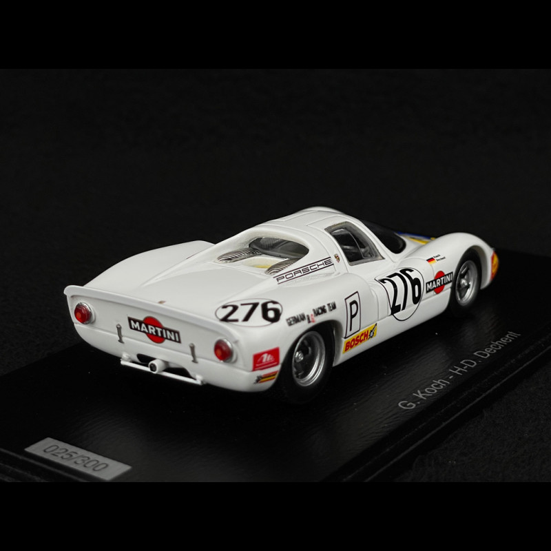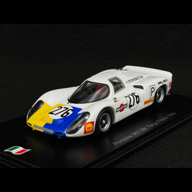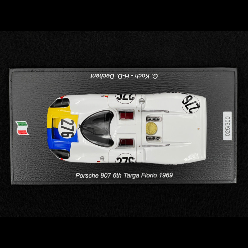 The 1:43 scale Porsche 907 #276 model, produced by Spark Models, faithfully reproduces one of the racing prototypes entered in the legendary 1969 Targa Florio, one of the most demanding and iconic road races in automotive history. This version, driven by Gerhard Koch and Hans-Dieter Dechent, finished in a strong 6th place in this highly technical competition in Sicily.