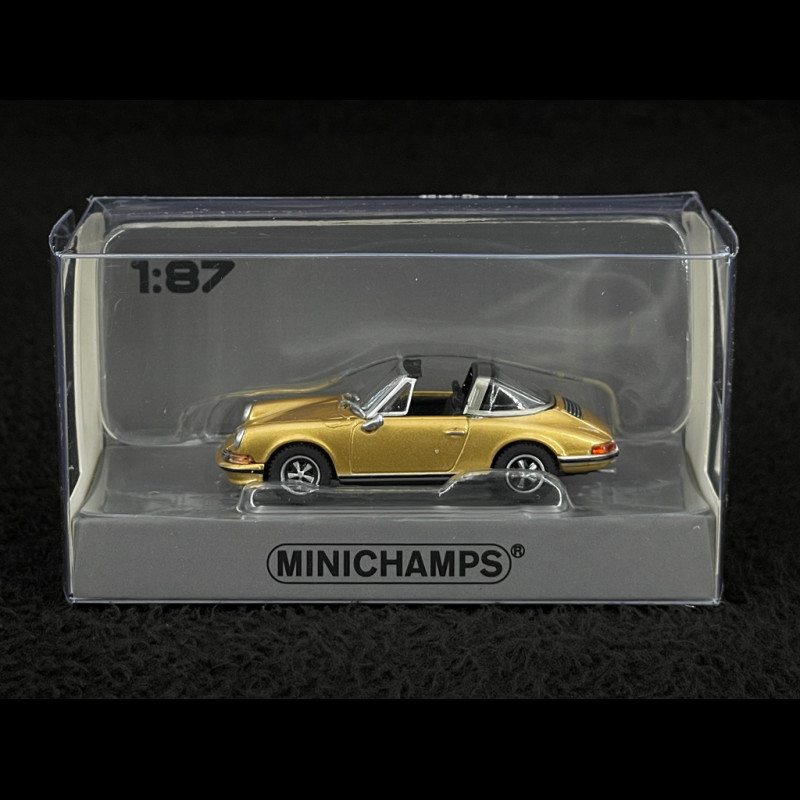 This Porsche 911 Targa (F-Series) reproduced by Minichamps stands out with its historic 'Gold Metallic' (Goldmetallic) paintwork, a vibrant and iconic color from the early 1970s Porsche palette.