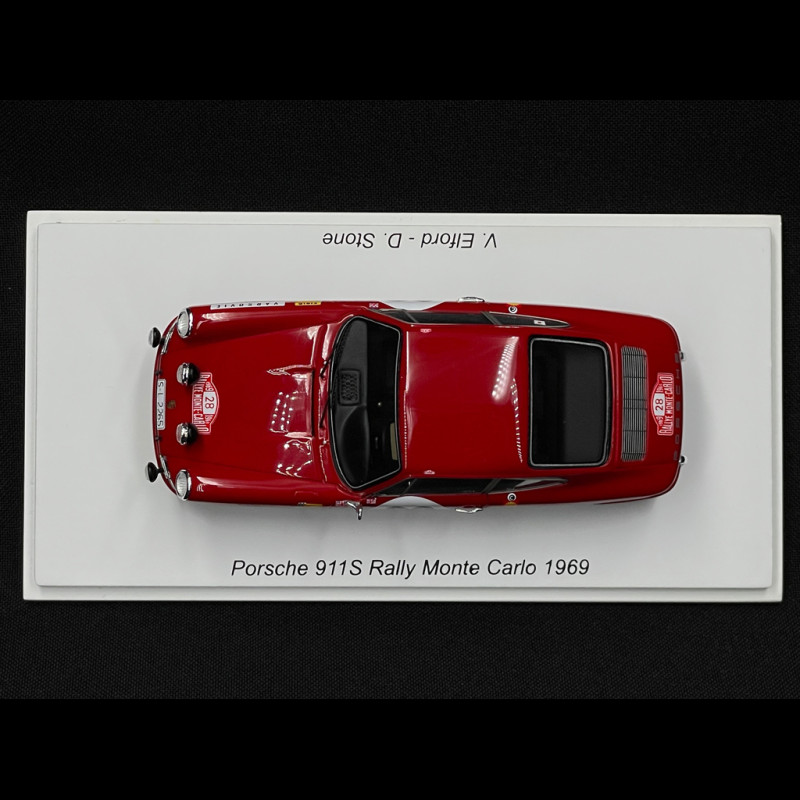 This 1/43 scale Porsche 911S No. 28 Monte Carlo Rally 1969 by Spark faithfully reproduces the car driven by Vic Elford and David Stone, with its red and white livery, number 28, and specific rally configuration details. Made of resin, the miniature highlights the auxiliary headlights, wheels, and racing markings, and is presented on a collector's base, ideal for complementing a display case dedicated to historic 911s and the golden age of Monte Carlo.