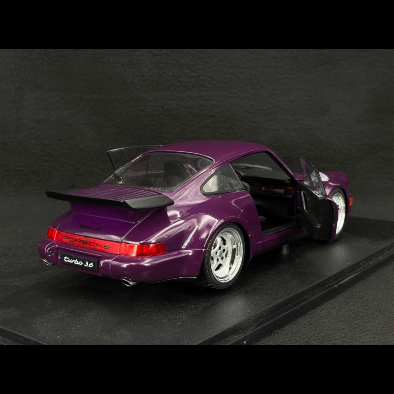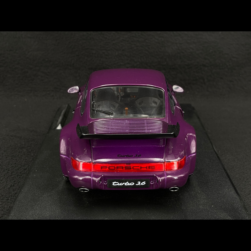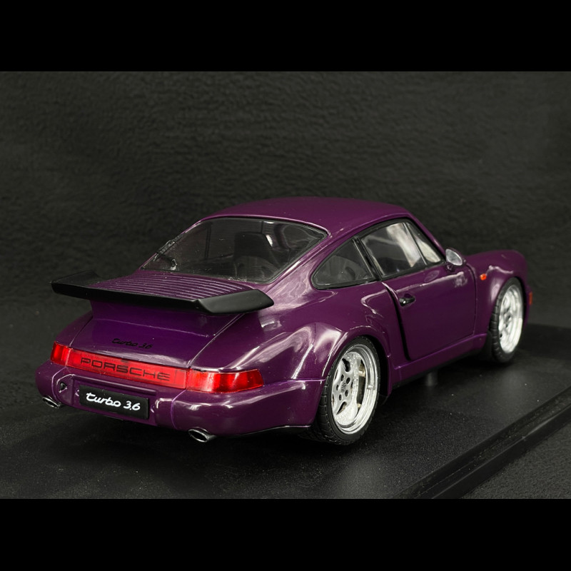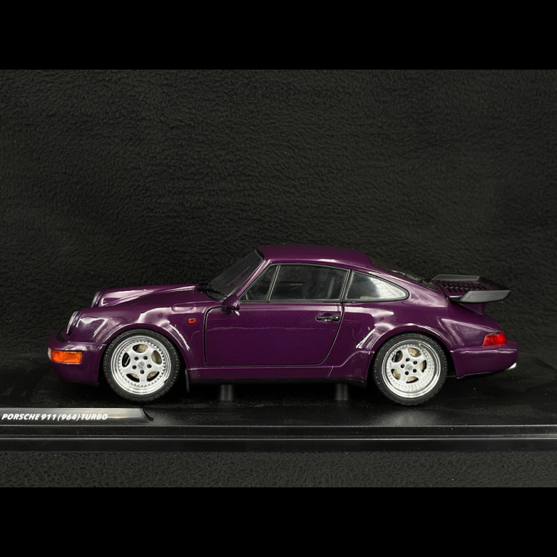 The model faithfully reproduces the design cues of the 964 Turbo: widened fenders, specific bumpers, a large "tea tray" style rear wing, period-correct Porsche wheels, and a slightly lower stance that emphasizes the car's width. This metallic violet version is a limited edition, making it particularly appealing to a collector who wants a colorful and accessible 964 Turbo alongside more high-end models in their display case.