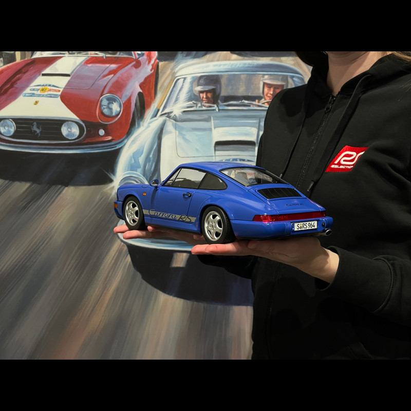 This 1/12 scale replica highlights the clean lines of the 964 RS in a white livery, perfectly complemented by the iconic Cup wheels of this generation. Made of metal on a large scale, the model makes a striking display case, with bodywork, interior, and running gear details that perfectly capture the radical spirit of the real RS.