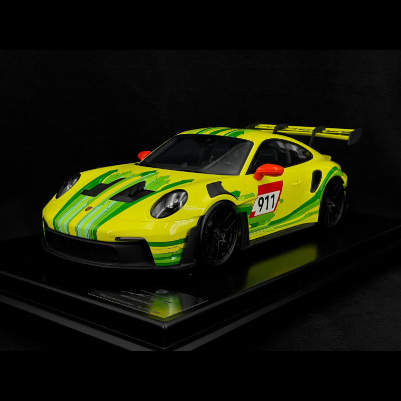 This exceptional 1/12 collector's model of the Porsche 911 GT3 RS Type 992 (2024) is finished in Yellow / Green Grello and produced by Spark in a **limited edition of 200 numbered units**. You are looking at the **rare unit no. 3 / 200**.