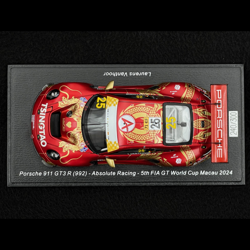 The Porsche 911 GT3 R Type 992 #25 – 5th FIA GT World Cup Macau 2024 – embodies Porsche's excellence in international GT racing. Designed to combine performance, precision, and endurance on demanding circuits, this 992 GT3 R retains the DNA of the 911 while incorporating an optimized chassis, advanced aerodynamics, and a naturally aspirated flat-six engine delivering exceptional power and responsiveness. Entered with the number 25 in the 2024 FIA GT World Cup in Macau, it finished in a remarkable fifth place, demonstrating Porsche's technical mastery and competitiveness on a narrow and winding track renowned for its difficulty. Its distinctive livery and specific aerodynamic enhancements reflect both the brand's heritage and innovation, offering a look that is both sporty and aggressive.