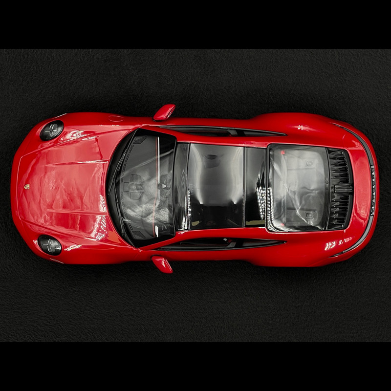 This Porsche 911 Carrera GTS (992.2) is an official collector's model designed by Porsche, crafted from metal to closely replicate the proportions and volumes of the real GTS. Offered in Carmine Red with a black interior, it showcases the stylistic evolutions of the 992.2: redesigned bumpers, enlarged air intakes, refined lighting signatures, and a very low stance on its GTS wheels, giving it a striking sporty presence in a display case.
