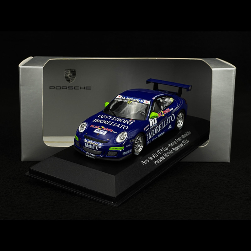 1/43 Minichamps scale model of the Porsche 911 GT3 Cup raced in the 2006 Porsche Supercup by Richard Westbrook (car n°17) for Racing Team Morellato. Features authentic dark blue livery with Morellato branding.