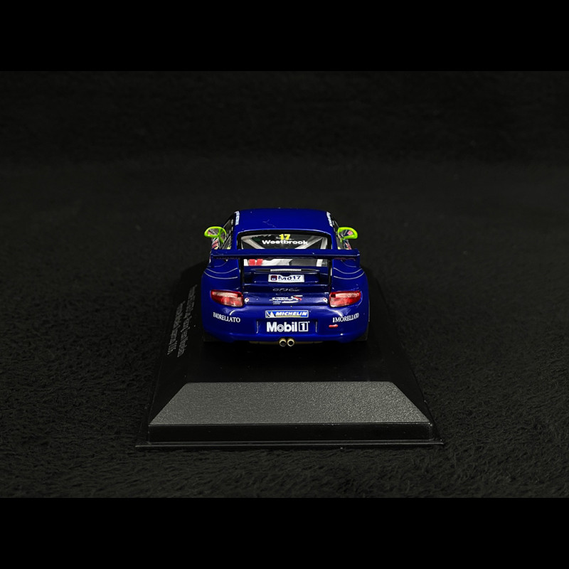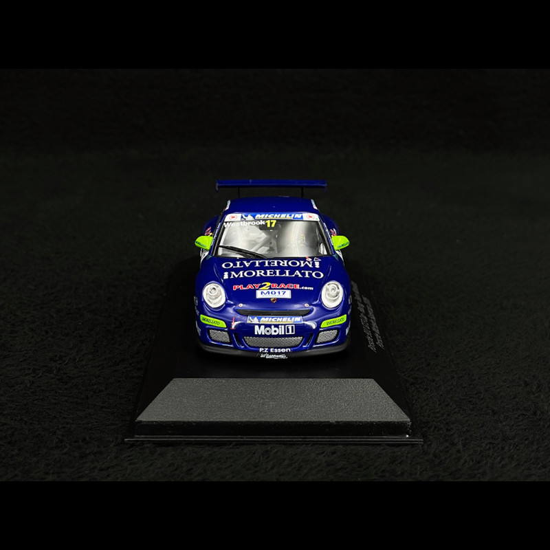 This 1/43 scale model replicates the Porsche 911 GT3 Cup Type 997 raced by Richard Westbrook during the 2006 Porsche Supercup season. Wearing number 17, this car was fielded by Racing Team Morellato and featured a dark blue Morellato-sponsored livery with Play2Race decals.