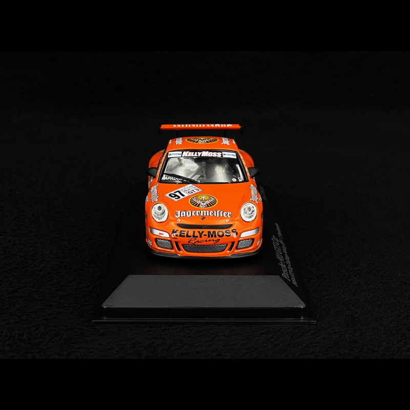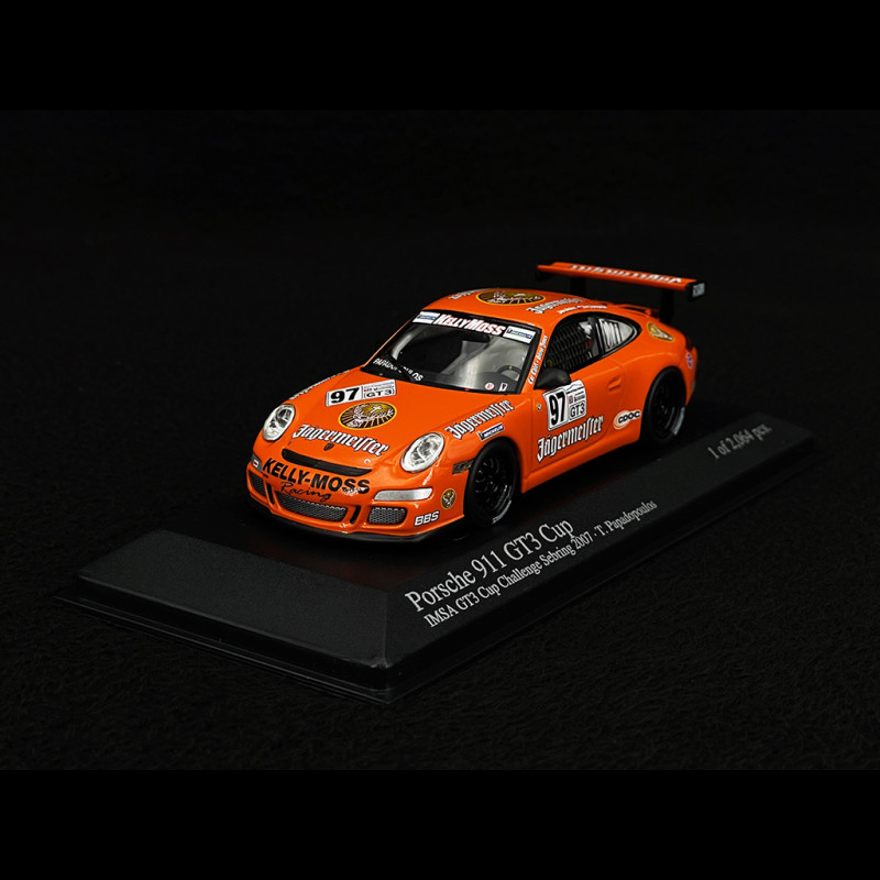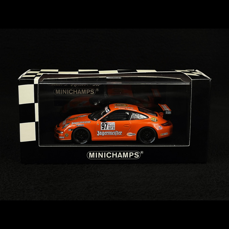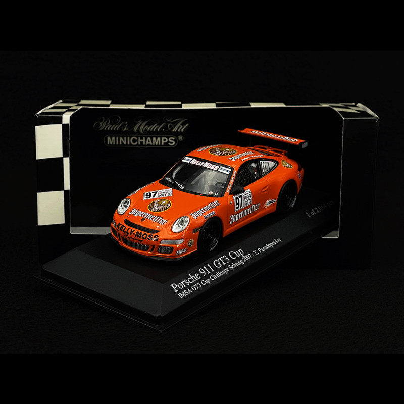 1/43 Minichamps model of the 2007 Porsche 911 GT3 Cup (997) driven by Tom Papadopoulos in the IMSA GT3 Cup. Orange Jägermeister livery, limited to 2064 pieces worldwide.