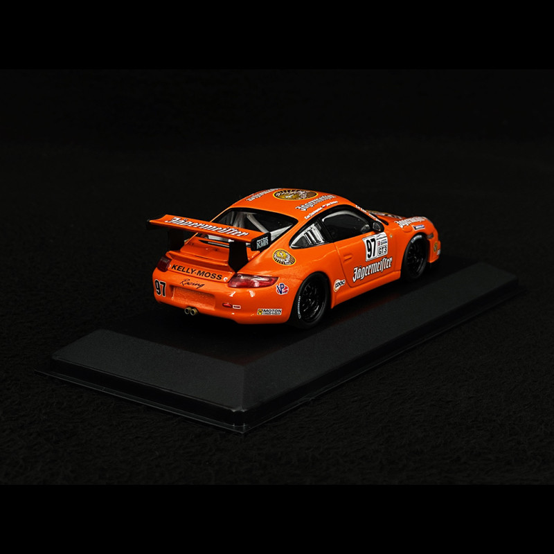 This 1/43 scale model accurately reproduces the Porsche 911 GT3 Cup Type 997 driven by Tom Papadopoulos in the 2007 IMSA GT3 Cup Challenge. Featuring the iconic orange Jägermeister livery and racing number 97, this car was part of the Kelly-Moss Racing lineup.