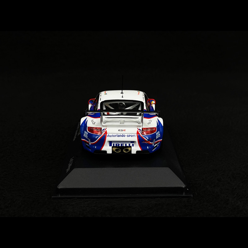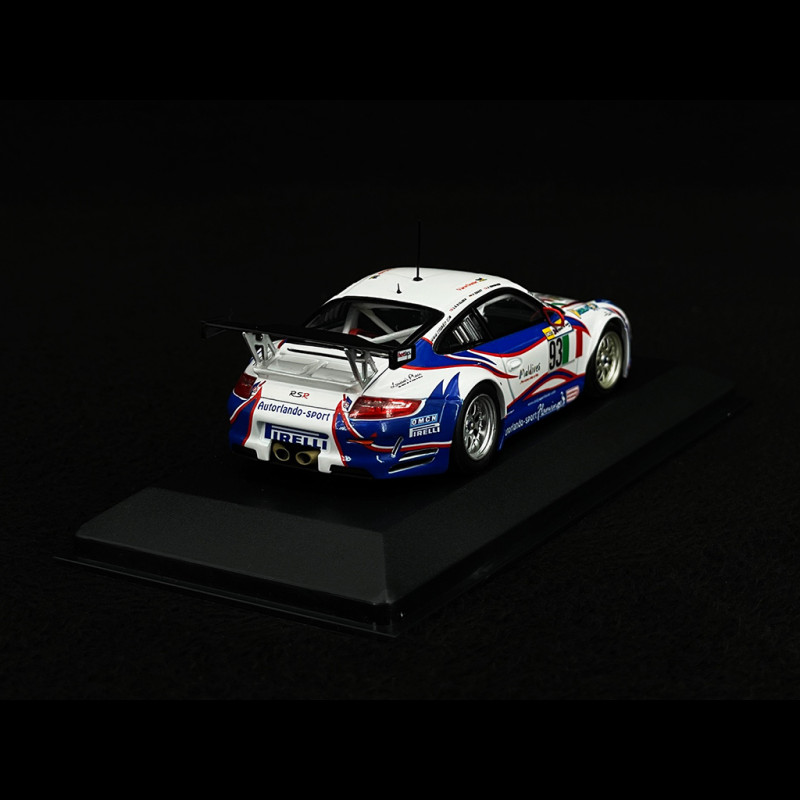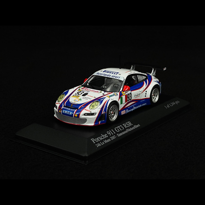 This 1/43 Minichamps scale model represents the Porsche 911 GT3 RSR (Type 997) fielded by Autorlando Sport during the 2007 24 Hours of Le Mans. The number 93 car was driven by Simonsen, Nielsen and Ehret, and wore the official Maldives/Flamingo white, blue and red livery.