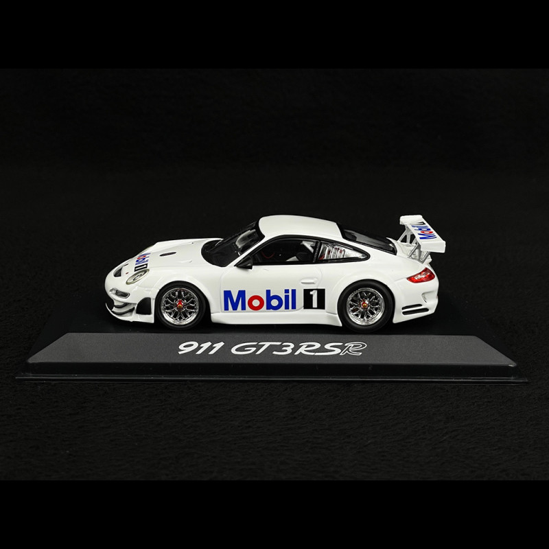 This 1/43 scale model by Minichamps features the Porsche 911 GT3 RSR (Type 997) in its official Mobil 1 demonstration livery. It is not a race-used car, but a factory promotional model created to showcase branding partnerships and GT3 development.