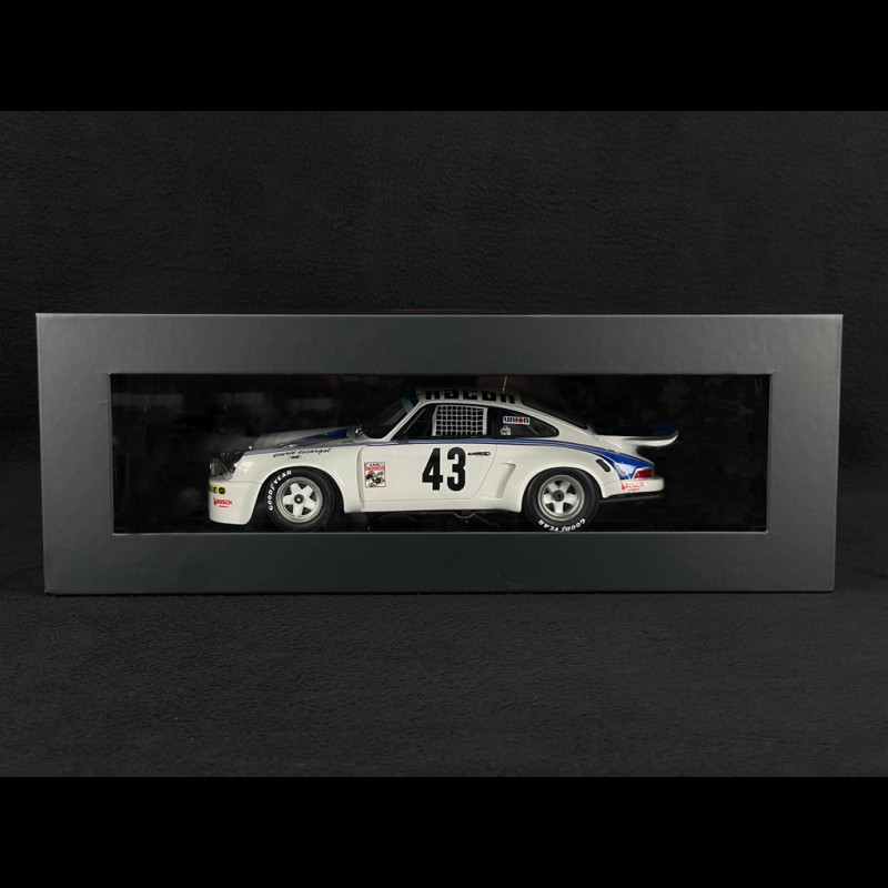 This 1/18 scale resin replica pays tribute to the Porsche 911 Carrera RSR No. 43, winner of the 1977 24 Hours of Daytona with Hurley Haywood, John Graves and Dave Helmick. The racing livery is faithfully reproduced with sharp, precise markings, while the bodywork highlights the RSR's distinctive aerodynamics and wider lines. The details – headlights, rims, air intakes and specific racing elements – are finely executed, offering remarkable realism. Delivered with its display case, this collector's item combines quality finish, historical authenticity and elegance, ideal for enthusiasts of endurance racing and classic Porsches.