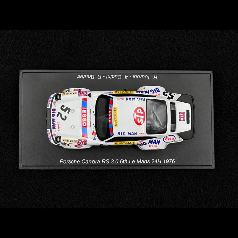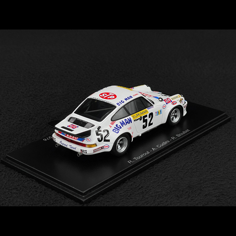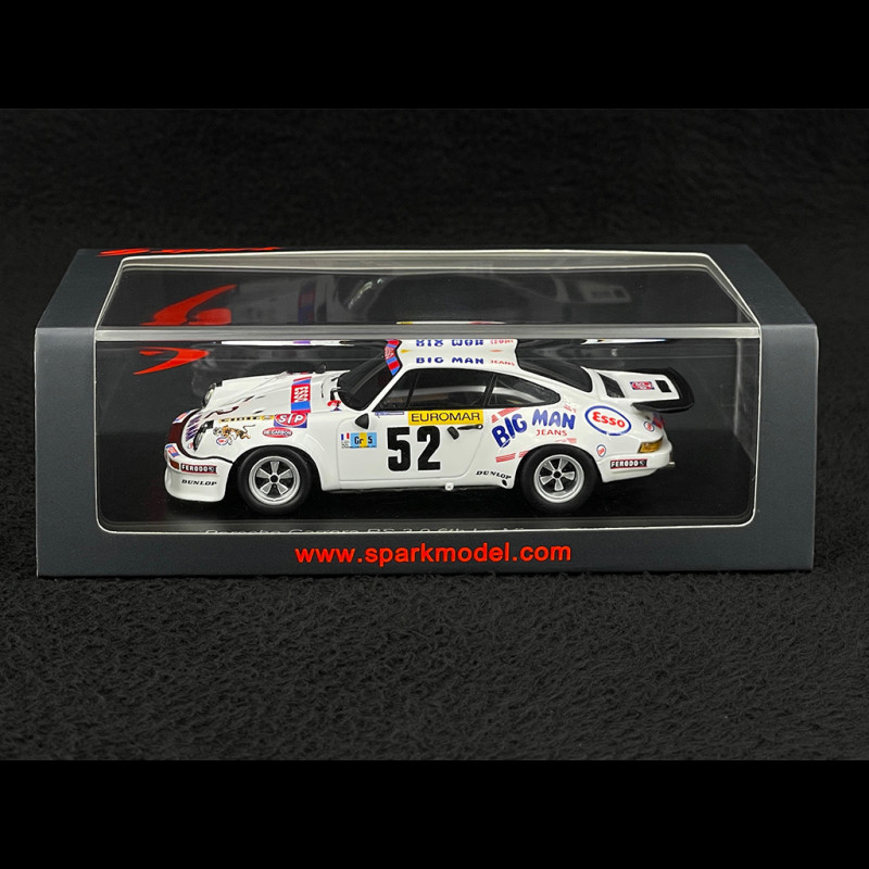 Spark reproduces the Porsche Carrera RS 3.0 #52 Le Mans 1976 in 1/43 scale in resin, with the "Big Man" livery, the number 52, and markings faithful to the car driven by Touroul/Cudini/Boubet. Delivered mounted on a base with a display case, the miniature highlights the widened fenders, front bumper, and rear end typical of the Carrera RS 3.0, making it ideal for a collection dedicated to 1970s Porsche endurance racers.