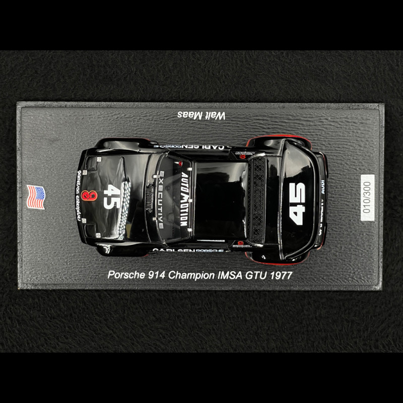 The 1:43 scale Porsche 914/6 #45, produced by Spark Models, faithfully reproduces the Porsche 914/6 that won the IMSA GTU championship in 1977, driven by Walt Maas, one of the leading figures in this category of the American series. This limited edition of 300 pieces highlights the racing style of the era with an authentic livery and markings inspired by the original car.
