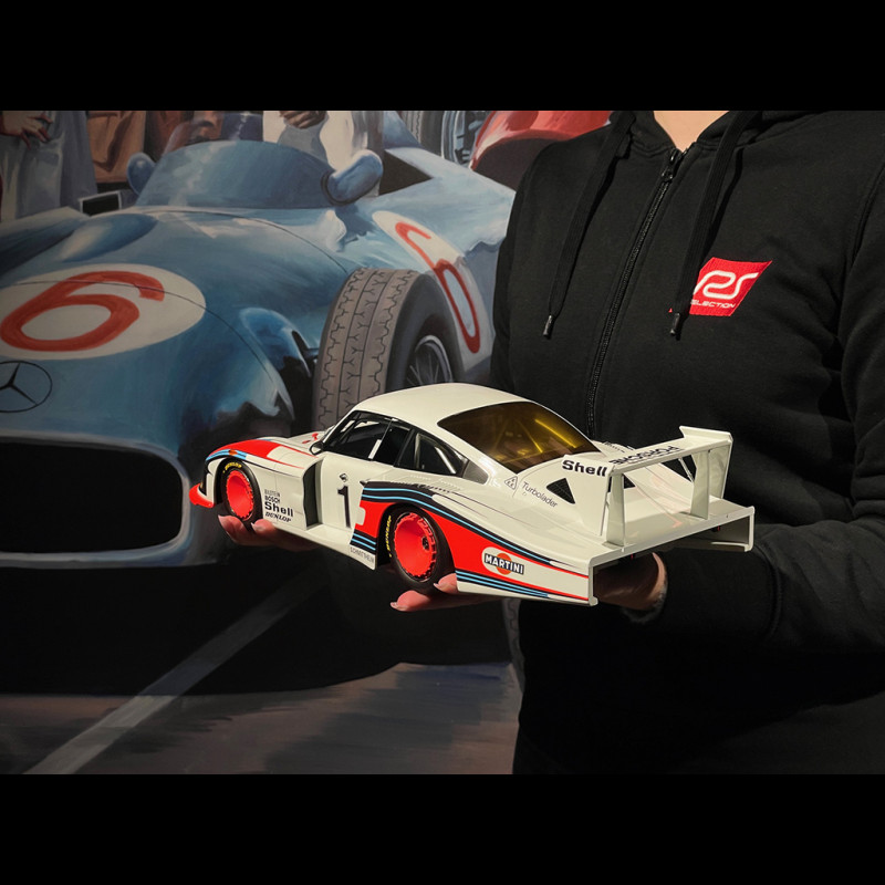 The Porsche 935/78 “Moby Dick” No. 1 – Martini Racing – 1978 World Endurance Championship is one of the most iconic and daring racing cars ever created by Porsche. With its extremely elongated silhouette and radical lines, nicknamed Moby Dick for its size and power, it embodies the extreme of 1970s German engineering. Entered by Jacky Ickx and Jochen Mass, No. 1 is distinguished by its comprehensive aerodynamic kit: widened fenders, massive front and rear spoilers, and a redesigned body for maximum stability on the fast circuits of the World Endurance Championship. Its turbocharged flat-six engine delivers colossal power, capable of competing with prototypes while maintaining legendary Porsche reliability.
