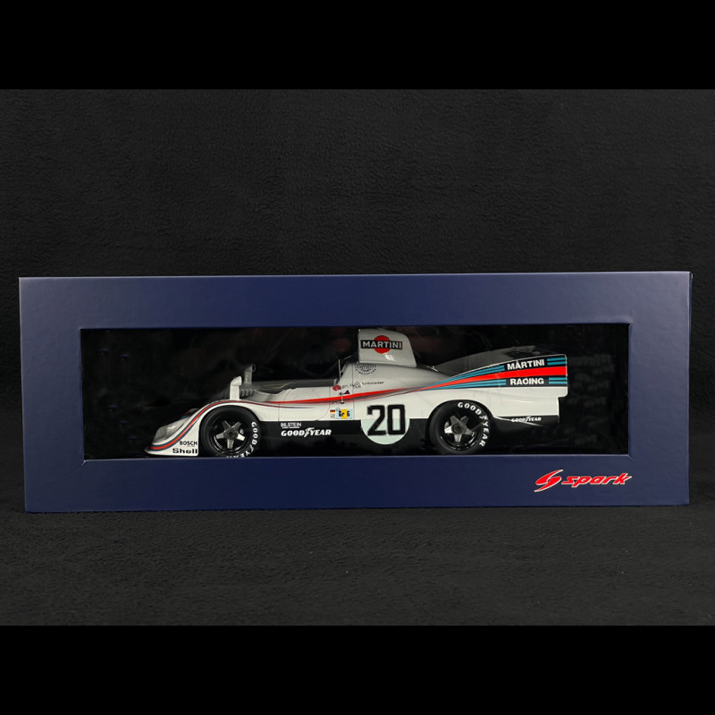 This 1/18 scale resin replica pays tribute to the legendary Porsche 936 No. 20, winner of the 1976 24 Hours of Le Mans in the iconic Martini Racing colours, driven by Jacky Ickx and Gijs van Lennep. The livery is reproduced with great precision, with clear and accurate markings, while the bodywork perfectly highlights the aerodynamic lines of the endurance prototype. The details – headlights, wheel rims, air intakes and cockpit – are finely executed, offering remarkable realism. Delivered with its display case, this collector's item combines quality finish, historical authenticity and elegance, ideal for enthusiasts of endurance racing and legendary Porsches.