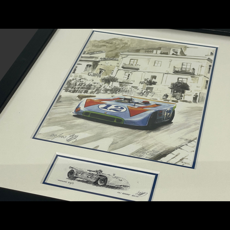 Porsche Frame 908/3 N° 12 Jo Siffert Winner "Targa Florio" 1970 Black Wooden Frame with Sketch 25 x 30 cm - Uli Ehret