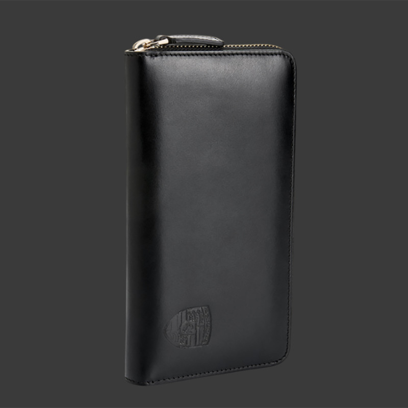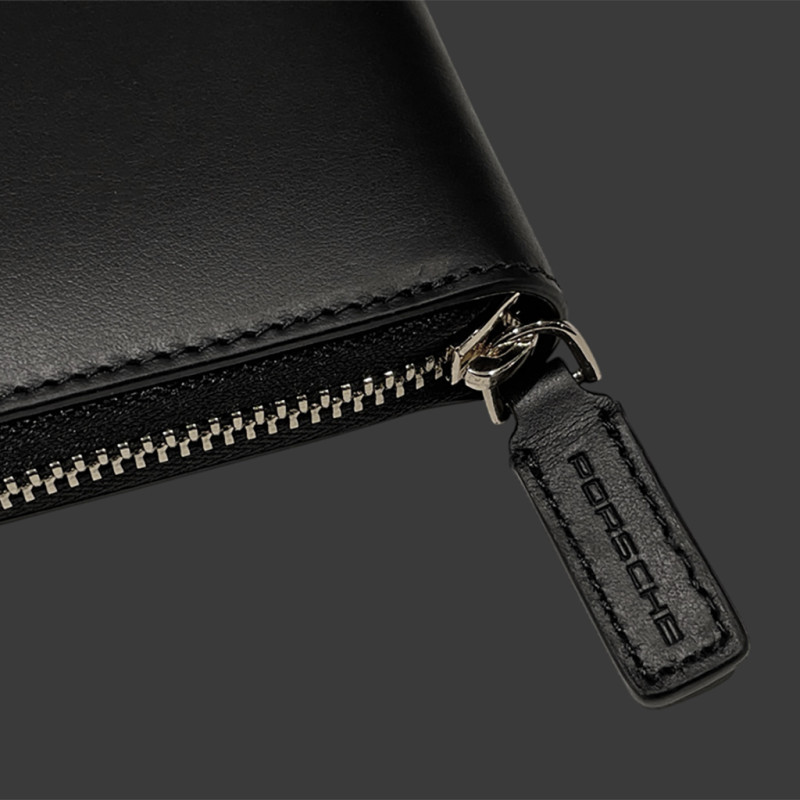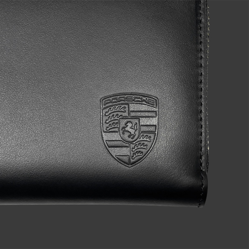 The design details are inspired by the automotive world: the contours of the card slots evoke the lines of the Taycan's headlights, while the contrasting stitching recalls the style of Porsche seats.