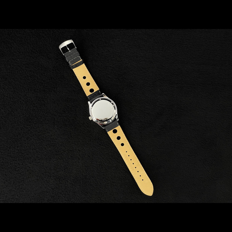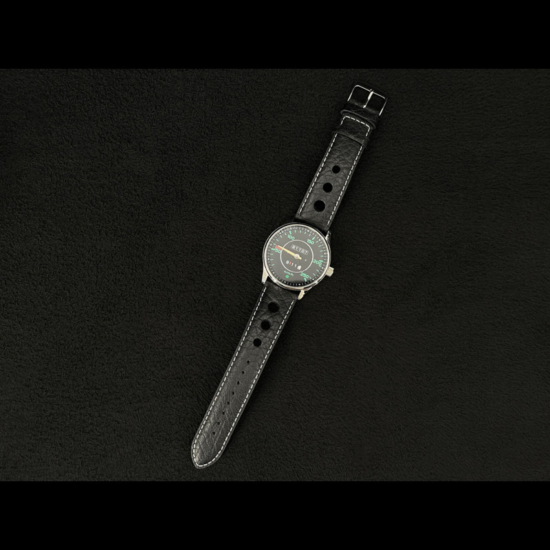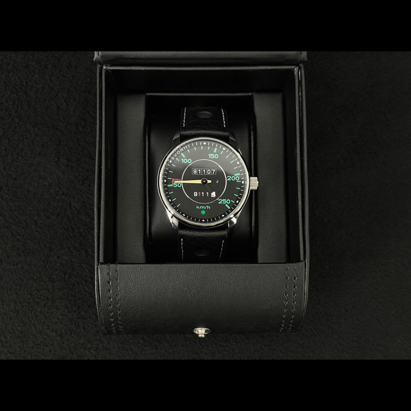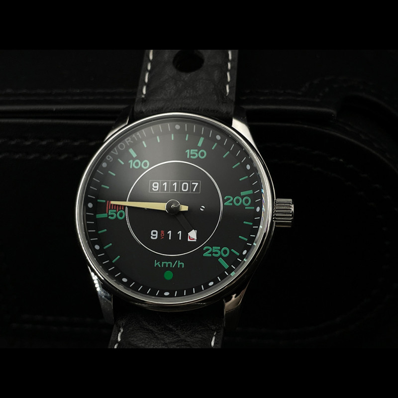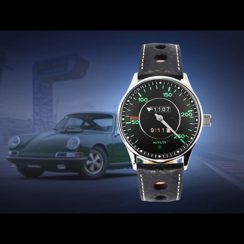 Inspired by the legendary speedometer of the Porsche 911 Classic (1963–1969), this watch features the iconic design with a black background, green numbers and a scale up to 250 km/h from the models of the 1960s.
