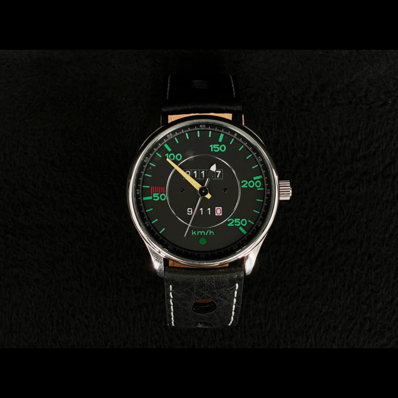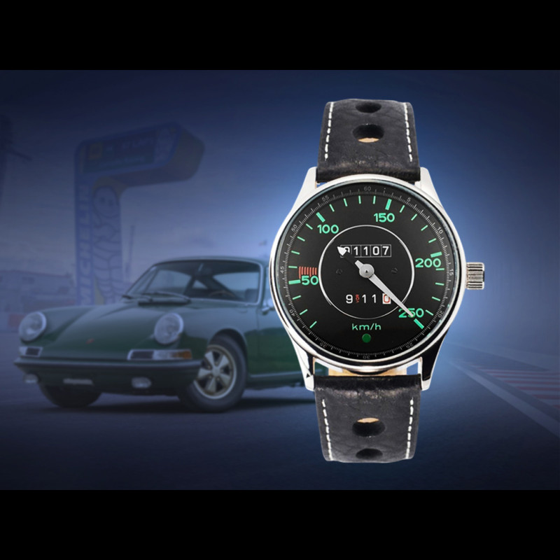Inspired by the legendary speedometer of the Porsche 911 Classic (1963–1969), this automatic watch features the iconic design with a black background, green numerals and a scale up to 250 km/h from the models of the 1960s.