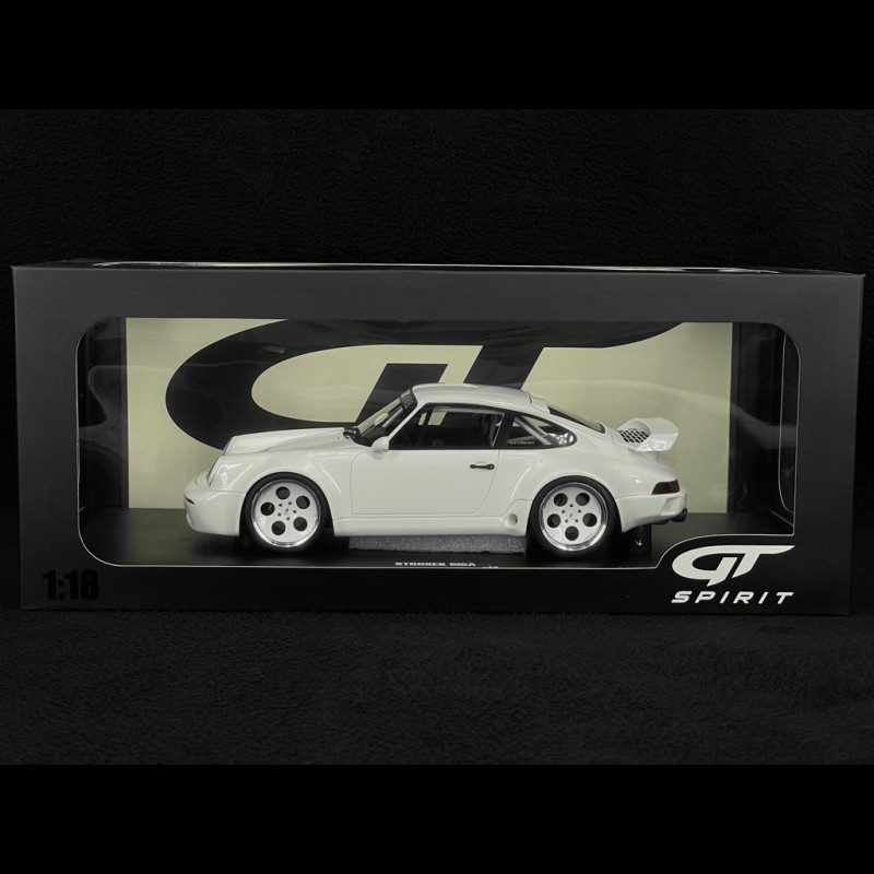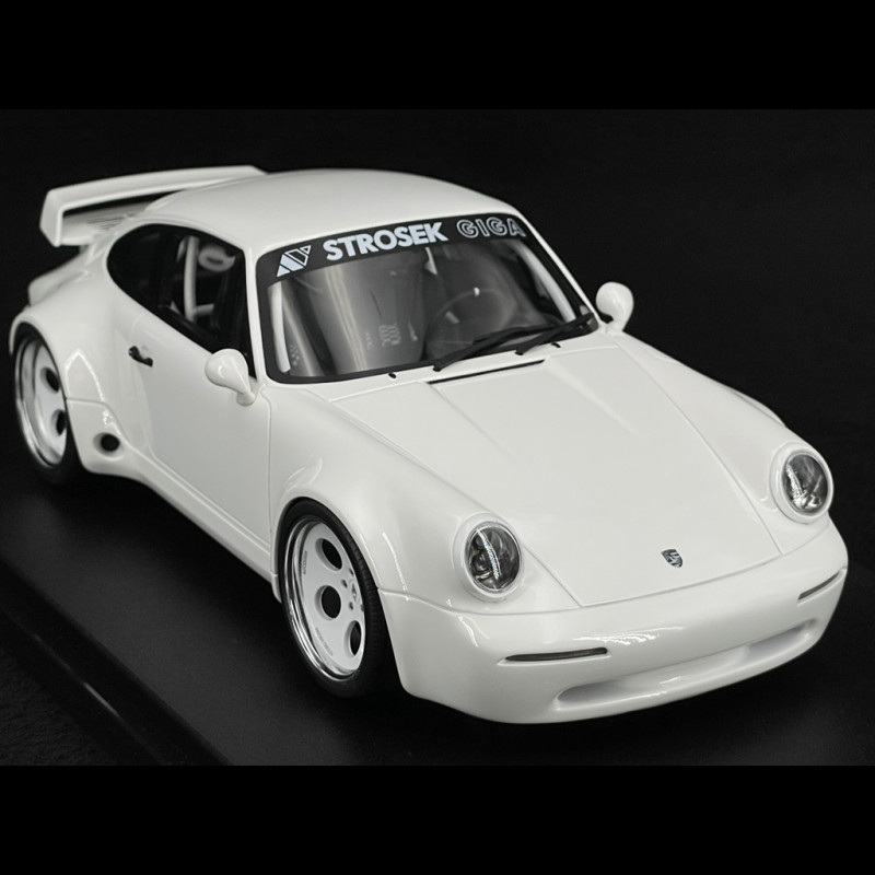 A true rarity, this Porsche 911 (964 type) modified by German tuner Strosek and reproduced by GT Spirit, captures the essence of 90s tuning with its highly atypical widebody kit; it is notably distinguished by the replacement of the original headlights with specific small round optics, redesigned front and rear bumpers, a prominent rear wing, and very deep-dish wheels, all presented in a Glacier White finish.