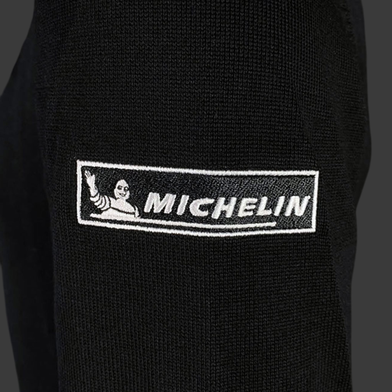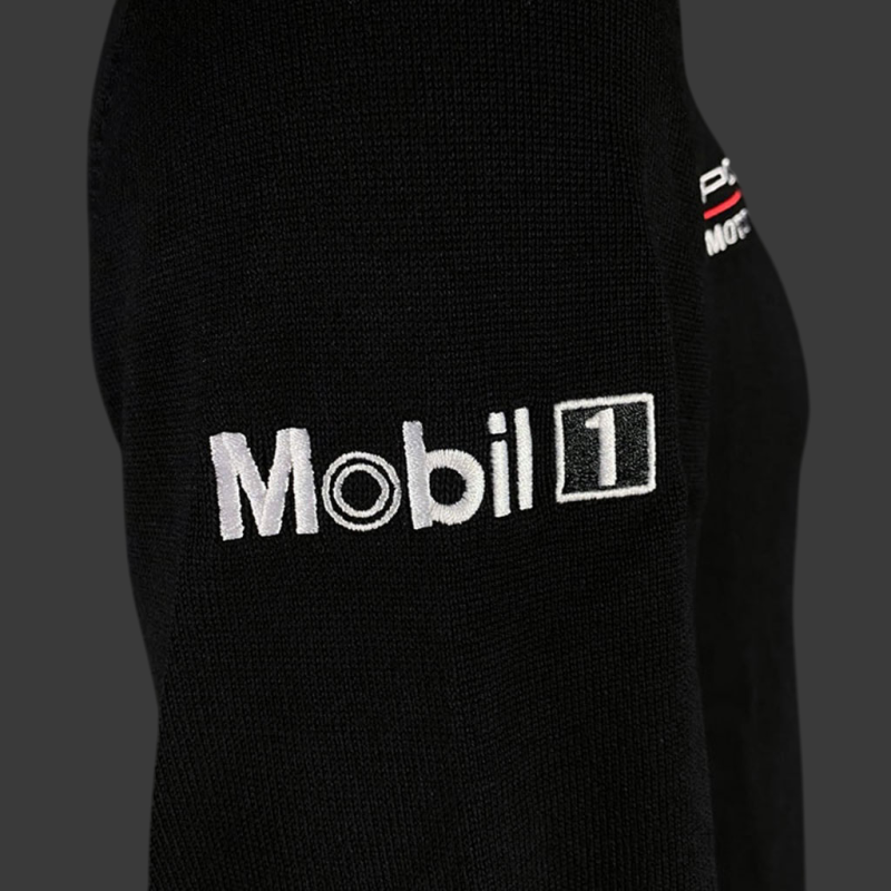 Embroidered Mobil and Tag Heuer logos on sleeves