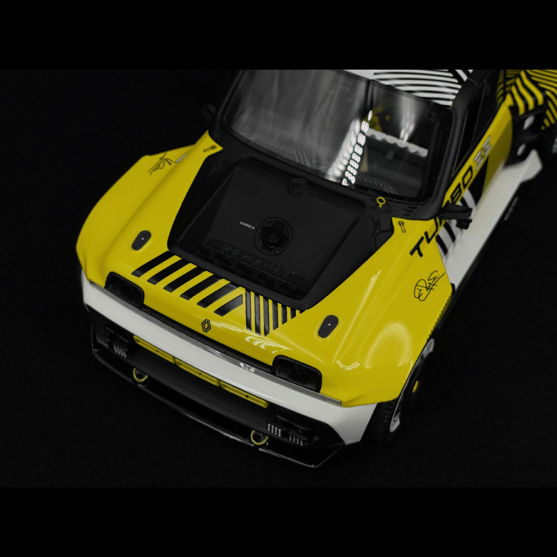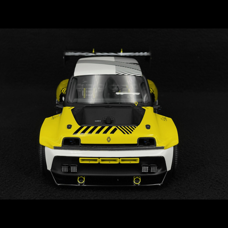 This 1/18 scale resin model of the Renault 5 Turbo 3E E-Tech RMC Look 2024, produced by OttOmobile, is a replica of the yellow and black "Rallye Monte-Carlo" show car version of the Turbo 3E concept. The body is fixed (no opening parts), with a very high level of detail on this electric drift-monster silhouette: ultra-wide fenders, massive front and rear bumpers, enormous air intakes, an oversized diffuser, a spectacular rear wing, and deep racing wheels, all in a limited-edition resin model designed to celebrate the R5 Turbo lineage in a futuristic interpretation.