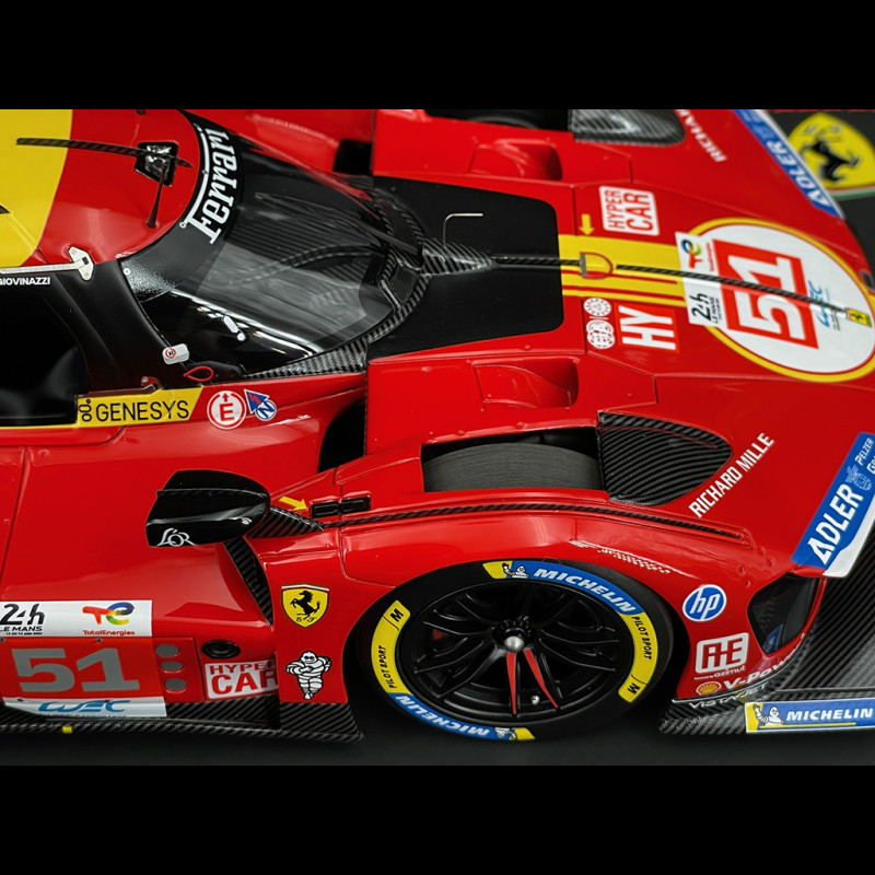 The Ferrari 499P #51 is a cutting-edge hybrid endurance prototype, designed by Ferrari to dominate the World Endurance Championship (WEC). Entered in the 2024 24 Hours of Le Mans, it finished in 3rd place, confirming the competitiveness and reliability of the Italian marque in the premier category of endurance racing.