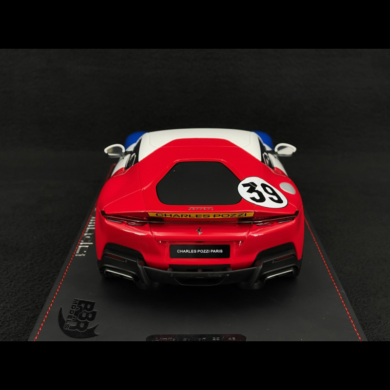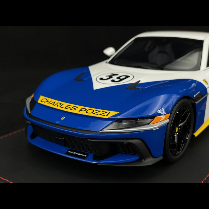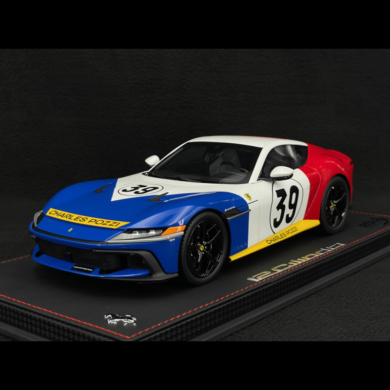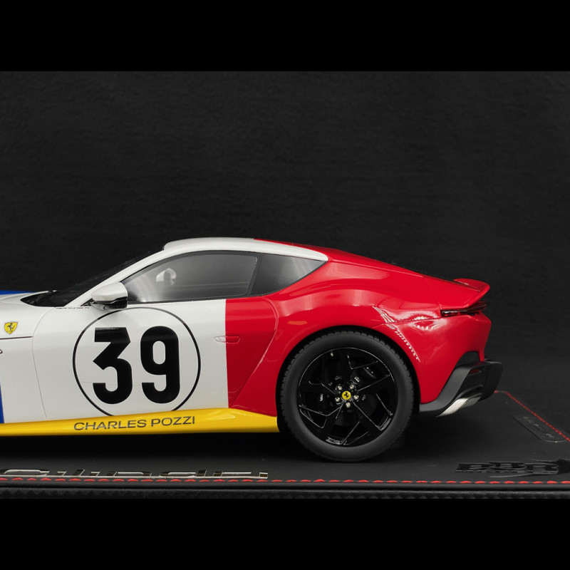 This 1/18 scale Ferrari 12 Cilindri miniature, made of resin by BBR, is a limited and numbered edition of 48 pieces. This exclusive edition pays tribute to the legendary 365 GTB/4 Daytona number 39, entered by Charles Pozzi in the 1972 24 Hours of Le Mans, where it finished 5th overall and won the GTS class. The model comes mounted on a premium base with a plaque, making it a ready-to-display piece that highlights the taut lines of the 12 Cilindri: long hood, set-back cockpit, short rear end, black front fascia inspired by the Daytona, and fine details on the wheels and brakes.