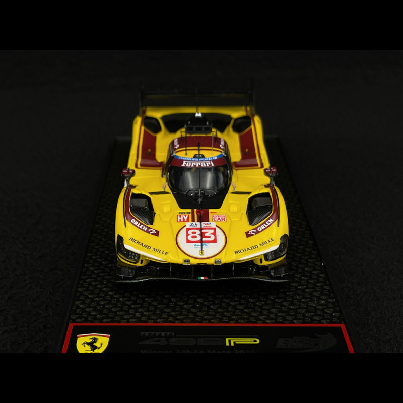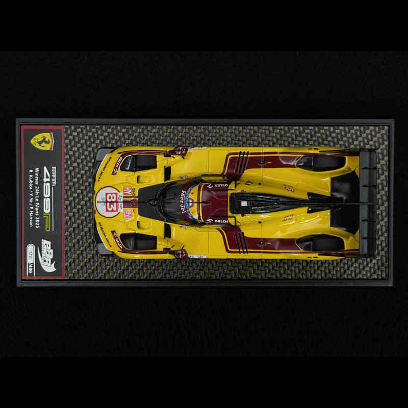 This miniature is the Ferrari 499P #83, 1/43 scale, produced by BBR and reproducing the AF Corse car that won the 2025 24 Hours of Le Mans with the Kubica/Ye/Hanson driver lineup.
