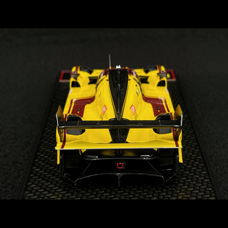 The model is made of sealed resin mounted on a display base, in the Le Mans prototype livery (yellow and red based on the 499P Hypercar), with complete racing markings and is limited to 499 numbered pieces. The details are finely reproduced, highlighting the premium aesthetic of this model.