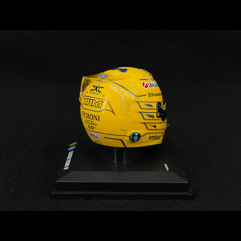 The 1/5 scale LookSmart miniature faithfully reproduces this helmet, with glossy paintwork, detailed patterns and meticulous finishes on the visor and straps, offering a realistic and prestigious collector's item, perfect for F1 and driver equipment enthusiasts.