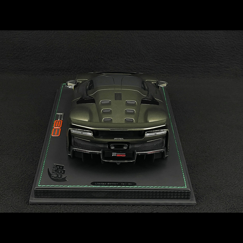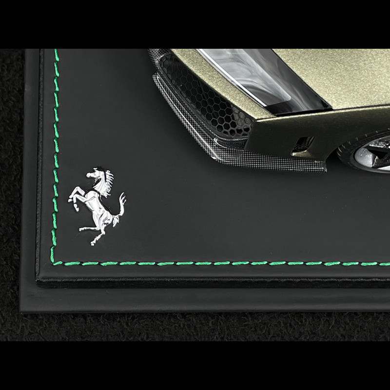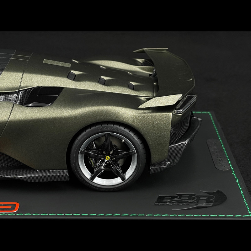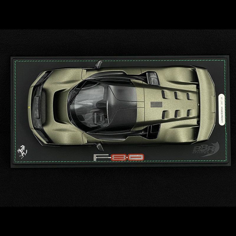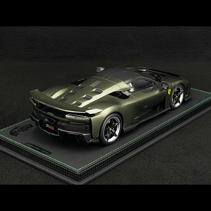 This 1/18 scale Ferrari F80 in Matte Verde Masoni by BBR is a resin miniature, without opening parts, that reproduces the hypercar in the matte Verde Masoni Opaco paint finish, paired with two-tone silver/carbon wheels for a truly exclusive look. Delivered mounted on a base, this limited edition highlights the sculpted lines of the F80, the matte finish, and the contrast with the two-tone wheels, making it ideal for a display case dedicated to special Ferrari configurations, modern hypercars, and the most high-end BBR models.