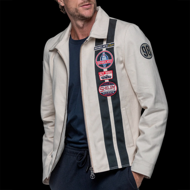 This ecru canvas jacket boasts a style inspired by the American paddocks, with a regular, straight cut that drapes naturally and an easy-to-match ecru color, in a workwear-inspired automotive style. The Carroll Shelby markings and the famous Snake logo provide the signature racing feel of the collection, while remaining discreet enough for everyday wear. Made from durable canvas fabric, it's designed for comfort and longevity, with a structured yet supple drape that flatters all body types. Ideal with raw denim or chinos, this jacket is for Shelby enthusiasts who want to pay homage to the brand's history without sacrificing style or comfort.