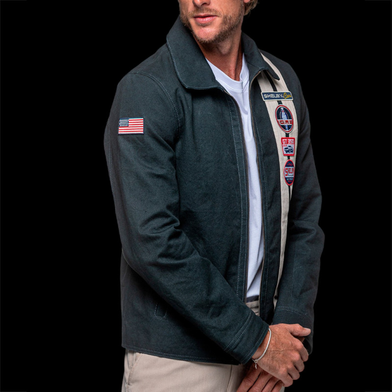 This navy blue canvas jacket features a style inspired by the American paddocks, with a regular, straight cut that drapes naturally and an easy-to-match ecru color, in a workwear-inspired automotive style. The Carroll Shelby markings and the famous Snake logo provide the signature racing feel of the collection, while remaining discreet enough for everyday wear. Made from durable canvas fabric, it's designed for comfort and longevity, with a structured yet supple drape that flatters all body types. Ideal with raw denim or chinos, this jacket is for Shelby enthusiasts who want to pay homage to the brand's history without sacrificing style or comfort.