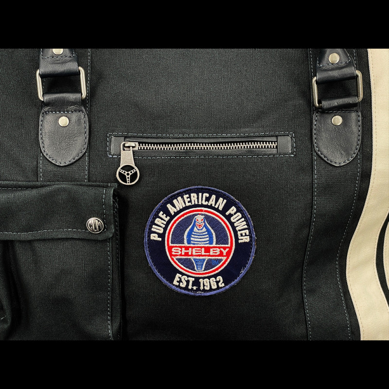 Its large zippered main compartment, storage pockets, and removable shoulder strap make it a practical piece of luggage, designed for light travel while maintaining a true enthusiast's appeal. Ideal for Shelby aficionados and connoisseurs of fine pieces who want a versatile bag, equally at home on a track weekend or a business trip.