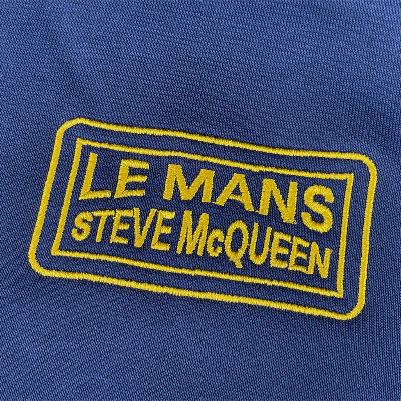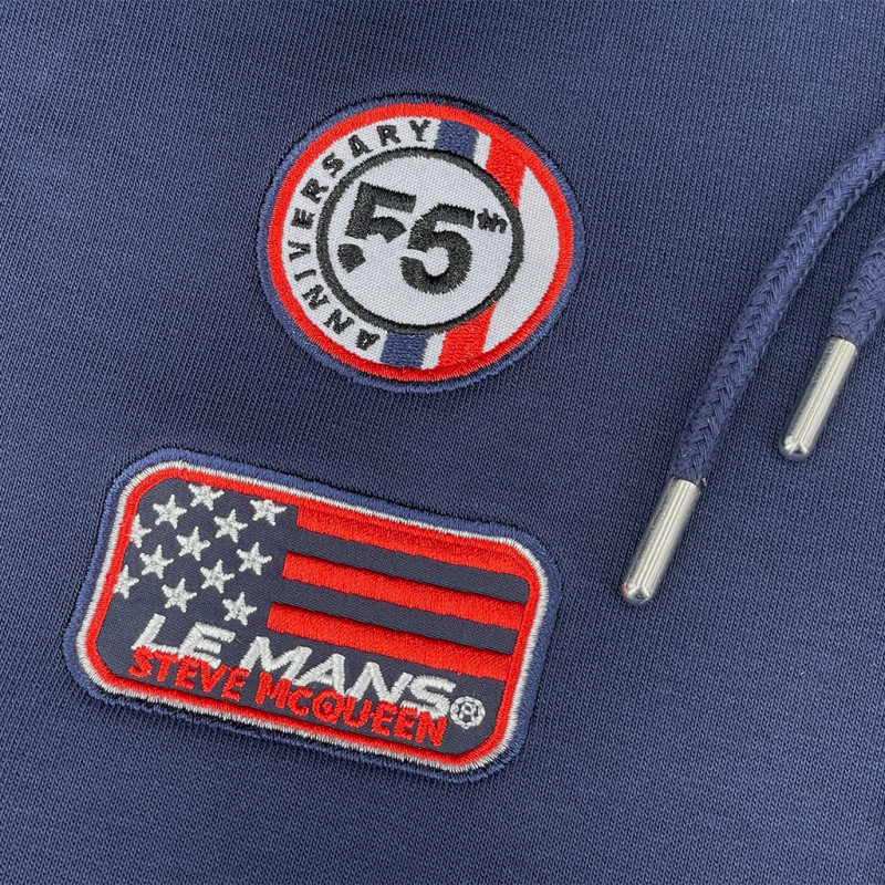 Show off your inner racer with this navy blue hoodie from the Steve McQueen x Le Mans collection. Its regular fit and dark blue color give it a vintage look that seems straight out of the 1970s paddocks. On the front, various embroidered markings evoke Steve McQueen's racing world, complemented by embroidered patches on the sleeves. Made from a comfortable cotton and polyester blend, it offers a structured drape ideal for everyday wear, from the paddocks to a café terrace.