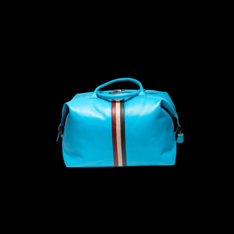 This stylish travel bag blends vintage flair and practical design. Made of genuine leather in a bold Nordic Blue, it features signature vertical racing stripes in cream, burgundy and black. Front USA patch and roundel n°20, with large 1971 emblem on the right pocket.